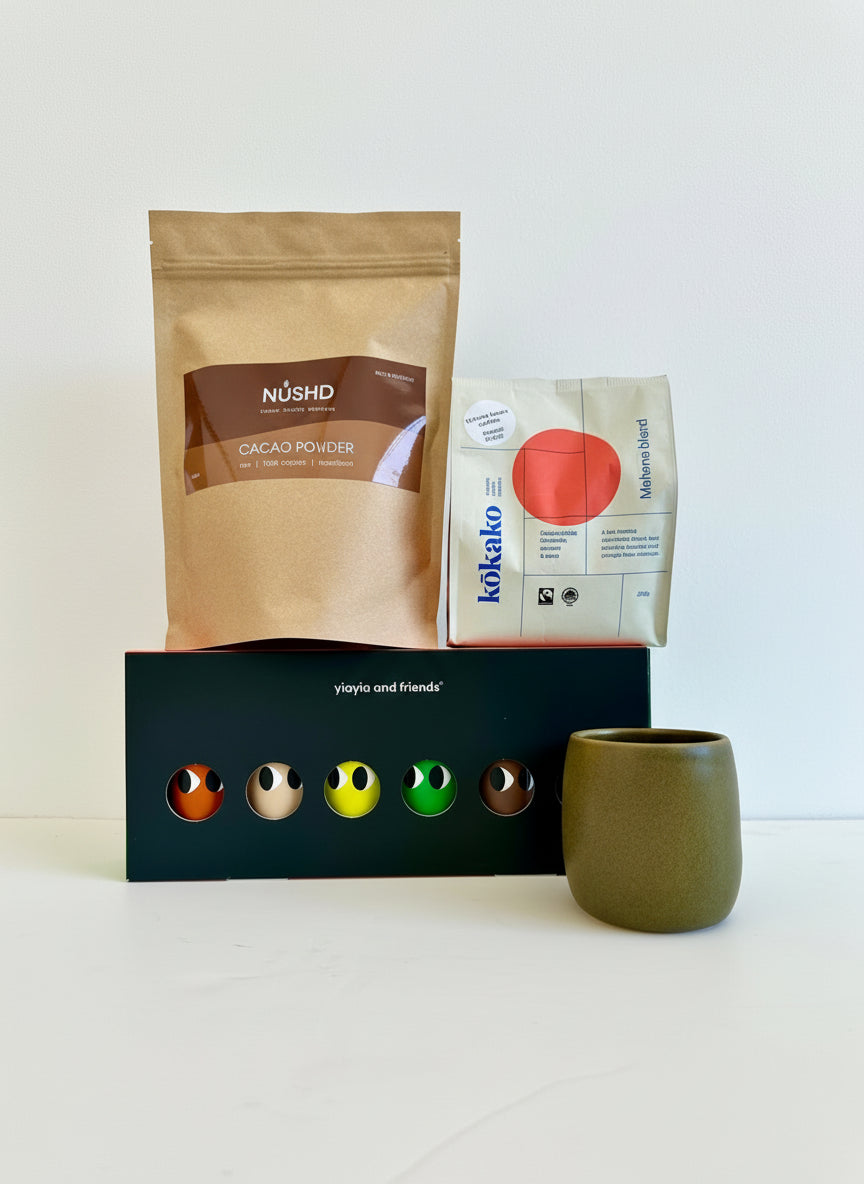 Inside, you'll discover our exquisite Yiayia and friends extra virgin olive oils, celebrated for their vibrant flavour, aromatic depth, complexity and exceptional health benefits.